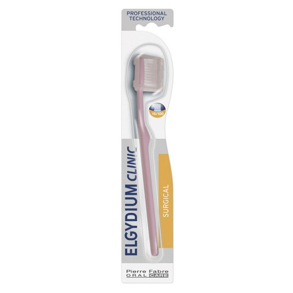 ELGYDIUM CLINIC CHIRURGICALE 15/100 est une brosse à dents adaptée à un retour progressif au brossage normal après une intervention chirurgicale de la bouche.