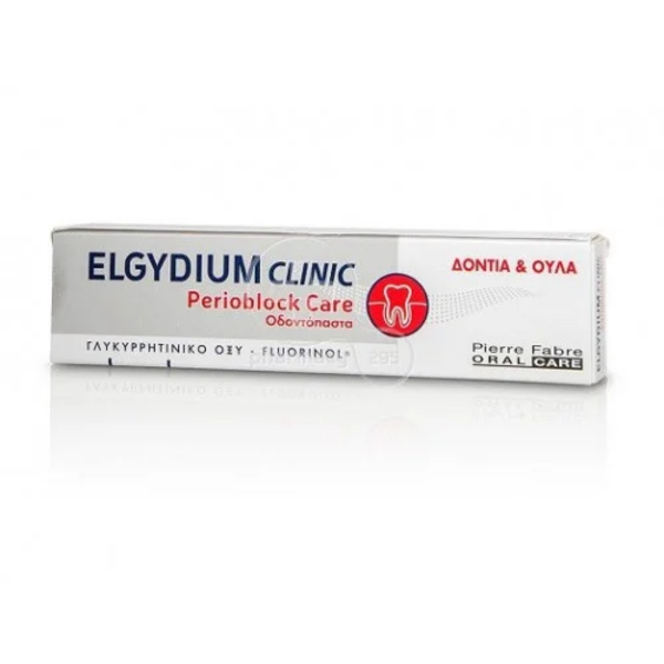 ELGYDIUM CLINIC Perioblock Care Dentifrice favorise la reminéralisation de l’émail grâce au Fluor, contribue au soin desgencives fragilisées et participe au bon état de la gencive ainsi qu’au confort au brossage.