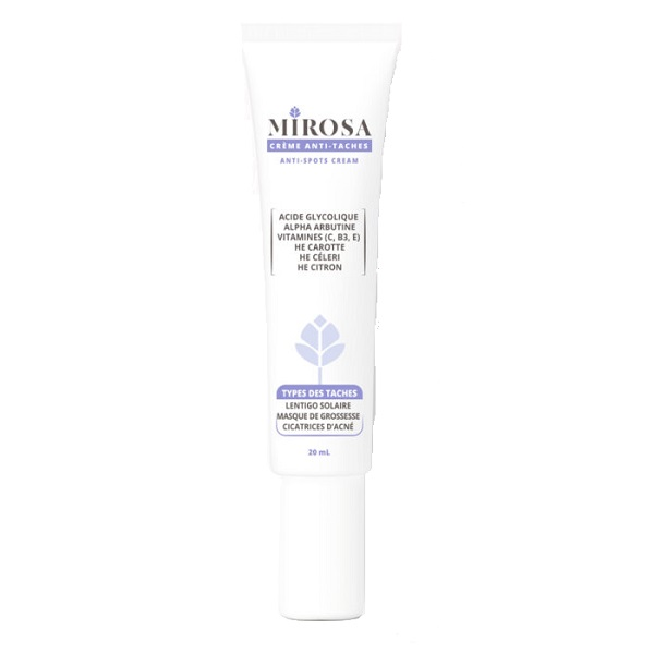 Crème Anti-taches Mirosa est Conseillée pour lutter contre les taches brunes liées au vieillissement cutané ou à la grossesse. Grâce à sa formule riche en huiles essentielles, actifs et vitamines, elle permet de :
