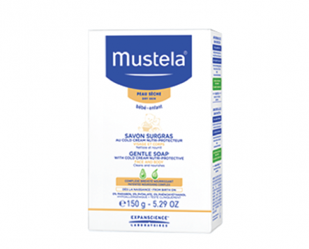 Mustela Savon surgras au Cold Cream nettoie délicatement le corps et le visage, grâce à sa base lavante douce (extraits naturels de palme).