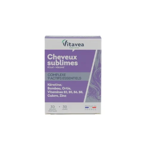 COMPLEMENT ALIMENTAIRE CHEVEUX : Le soin cheveux sous forme de gélule Vitavea Cheveux sublimes est votre allié pour retrouver des cheveux plein de vitalité grâce à sa formule triple action. Ce complément alimentaire cheveux apporte éclat et volume aux cheveux grâce à ses 9 actifs star que sont le zinc, le cuivre, la kératine, l’ortie, le bambou, la vitamine B6, la vitamine B5, la vitamine B8, la vitamine B2