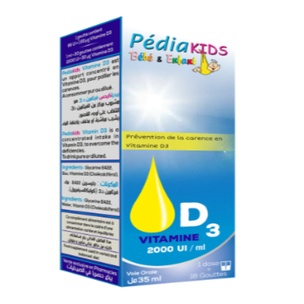 Pédiakids Vitamine D3 optimise les apports en vitamine D, qui contribue à l’absorption du calcium et au capital osseux. INDICATIONS – Solidifier les os, Ostéoporose – Stimule la croissance – Renforce le système immunitaire