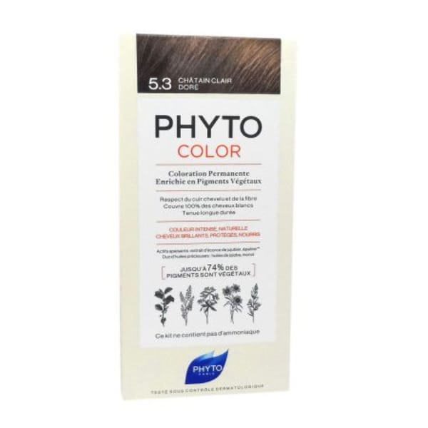 Phyto Phytocolor 5.3 châtain clair doré est une coloration permanente aux pigments végétaux qui offre une couleur naturelle qui tient longtemps et couvre 100% des cheveux blancs dès la 1re application. Testée dermatologiquement, cette coloration respecte le cuir chevelu et la nature du cheveu et limite les risques d’allergies. En effet, elle ne contient ni PPD (para-phénylènediamine), ni résorcine.