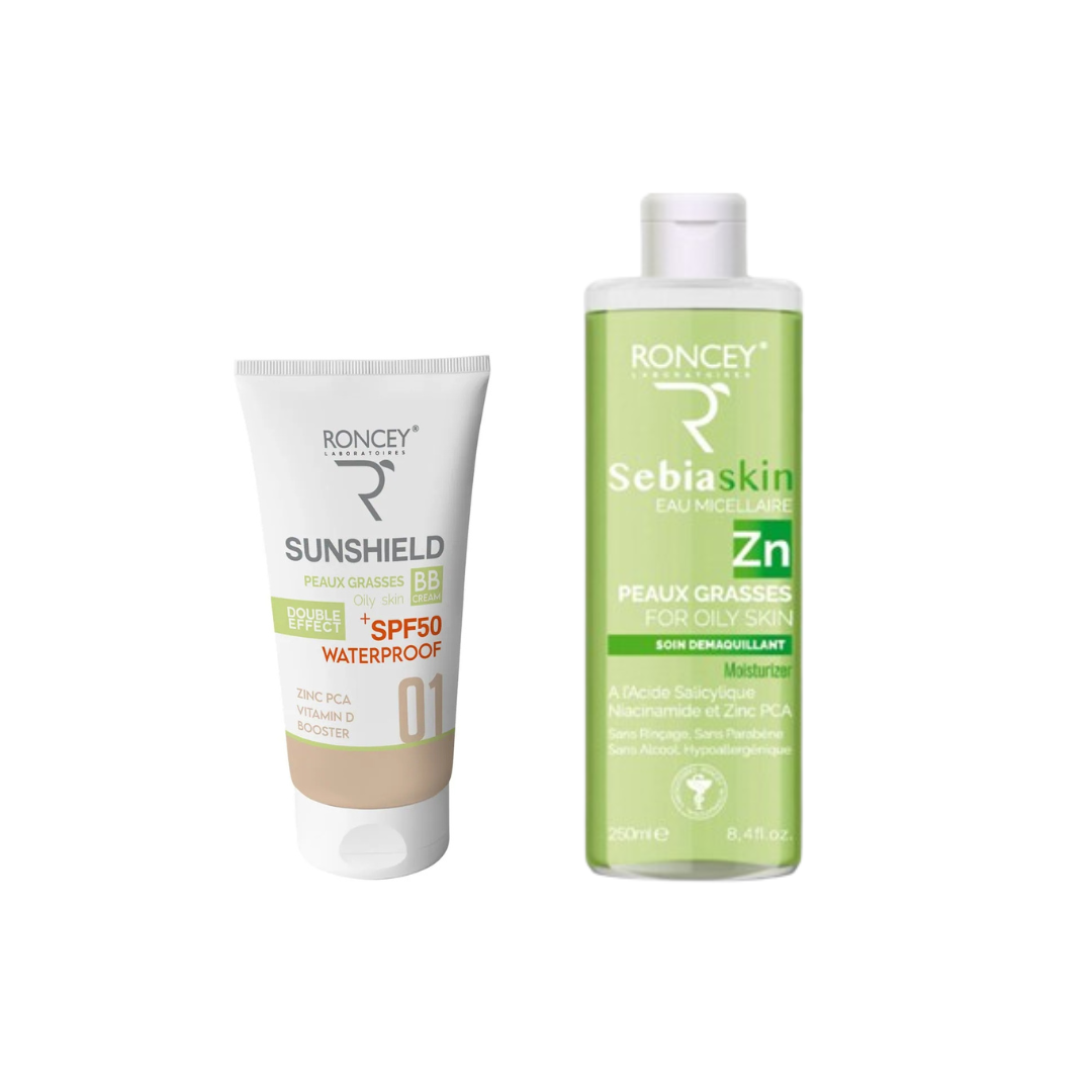 Roncey Sunshield teinté 01 peaux grasse SPF50+ 50ml+Eau micellaire 250ml (offert)