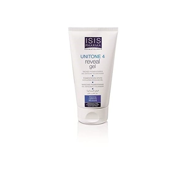 Unitone 4 reveal Gel Exfoliant Eclaircissant moussant Unitone 4 reveal Gel nettoie et exfolie le visage et lui donne une sensation immédiate de fraîcheur et de clarté. Son complexe de 4 actifs agit sur la surproduction de mélanine et éliminine la mélanine préformée à la surface de la peau.Mode d’action:- L’extrait de Licorice agit sur la suproduction de mélanine